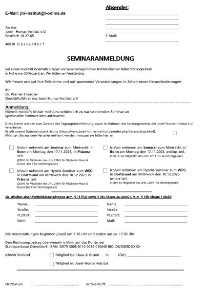 Wir würden uns freuen, Sie und Ihre Mitarbeiter auch in diesem Jahr wiederum als Teilnehmer begrüßen zu können. Gerne können Sie sich auch über unser Internetportal unter www.josef-humar-institut.de informieren bzw. anmelden.